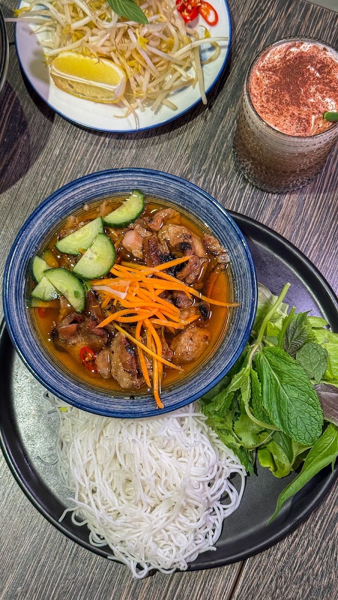 For diners who enjoy bold flavors and texture, the Bun Cha Ha Noi Vermicelli Noodle with Char-Grilled Pork Fish Sauce Pickle and Herbs stands out. The combination of grilled pork, light noodles, and fresh herbs creates a balanced dish that’s both hearty and refreshing. Vegetarian diners aren’t left out either. The Vegan Net Spring Rolls Served 5 Pieces offer a crisp bite with a light, clean finish, making them a solid choice to share or enjoy on their own. To round out the meal, the Fresh Sugar Cane Juice adds a naturally sweet and cooling note that pairs well with the savory dishes.